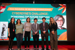 Já no dia 26 de fevereiro, o Prof. Yoshiyuki Sankai, da Universidade de Tsukuba e CEO da CYBERDYNE Inc., trouxe ao debate o futuro da inovação em cibernética médica e os desafios do envelhecimento populacional. A discussão sobre tecnologia, políticas públicas e cooperação Brasil–Japão ampliou o horizonte estratégico dos estudantes, conectando Relações Internacionais, saúde e inovação.
